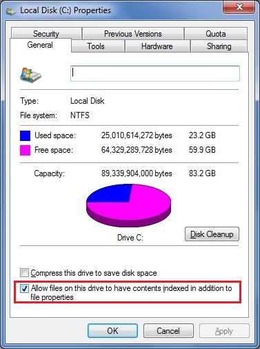 3. Uncheck the box at the bottom that reads "Allow Indexing Service to index this disk for fast file searching"